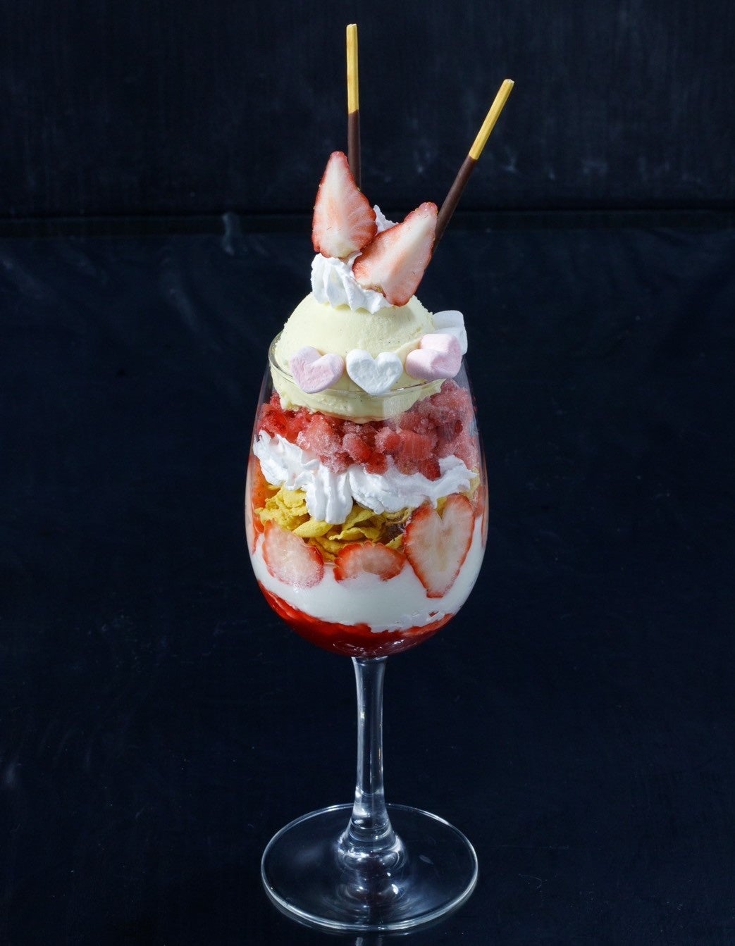 目にも鮮やかなイチゴパフェは五感で味わえるメニューとなっております。ワイングラスに敷き詰められたジューシーなハート形の生イチゴと、爽やかな酸味にひんやりと口の中をさっぱりさせてくれる冷凍イチゴの2種が入っています。バニラアイス、ホイップクリームでデザートならではの甘さも楽しめます。そして、イチゴソースにヨーグルト、無糖のコーンフレークでさっぱりとした層を作っており、食後にもサラっと頂けます。