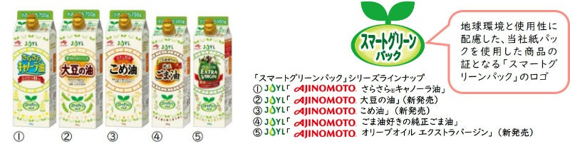 そこで今回、新製品として紙パックを採用した環境配慮型商品「スマートグリーンパック」にエクストラバージンオリーブオイル・こめ油・大豆の油を追加し、全5種類をラインナップします。パッケージも、店頭で見つけやすく、油種の違いがわかりやすいデザインにリニューアルし、「スマートグリーンパック」のロゴも配置します。本品の発売を通じて、当社はSDGsの達成に貢献していきます。