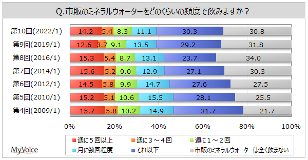 マイボイスコム株式会社(東京都千代田区、代表取締役社長:高井和久)は、インターネット調査を中心に提供している伊藤忠グループのリサーチ会社です。この度、10回目となる『ミネラルウォーターの飲用』に関するインターネット調査を2022年1月1日~5日に実施し、10,085件の回答を集めました。本調査のミネラルウォーターは、ウォーターサーバーは含みません。また、味や香りがついたものも含みません。調査結果をお知らせします。