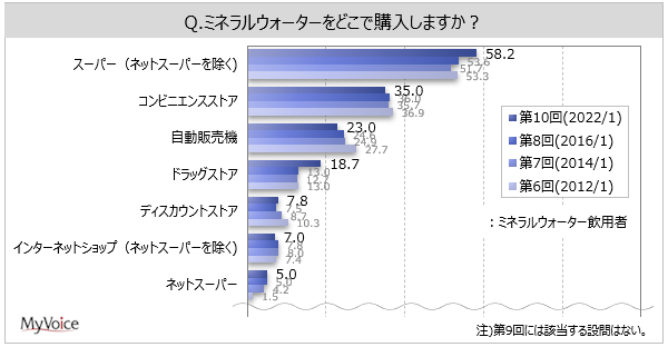 ミネラルウォーターの購入場所は(複数回答)、「スーパー」が飲用者の58.2%、「コンビニエンスストア」が35.0%、「自動販売機」が23.0%です。2016年調査と比べて、「ドラッグストア」が増加しています。『い・ろ・は・す』『エビアン』主飲用者では、「コンビニエンスストア」の比率が高くなっています。