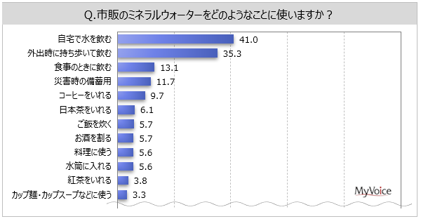 ミネラルウォーターの使用場面は(複数回答)、「自宅で水を飲む」が41.0%、「外出時に持ち歩いて飲む」が35.3%、「食事のときに飲む」「災害時の備蓄用」が各1割強となっています。