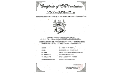 ソシオークグループは、2014年7月1日より「ソシオーク油田プロジェクト」として TOKYO油田2017プロジェクトに参加しています。昨年はソシオークグループの保育園等において2,865㎏の使用済み食用油を回収し、再資源化につなげることで、二酸化炭素の量に換算すると5,413㎏分の削減をいたしました。TOKYO油田より、二酸化炭素の削減に貢献したことを証明されましたことをお知らせいたします。