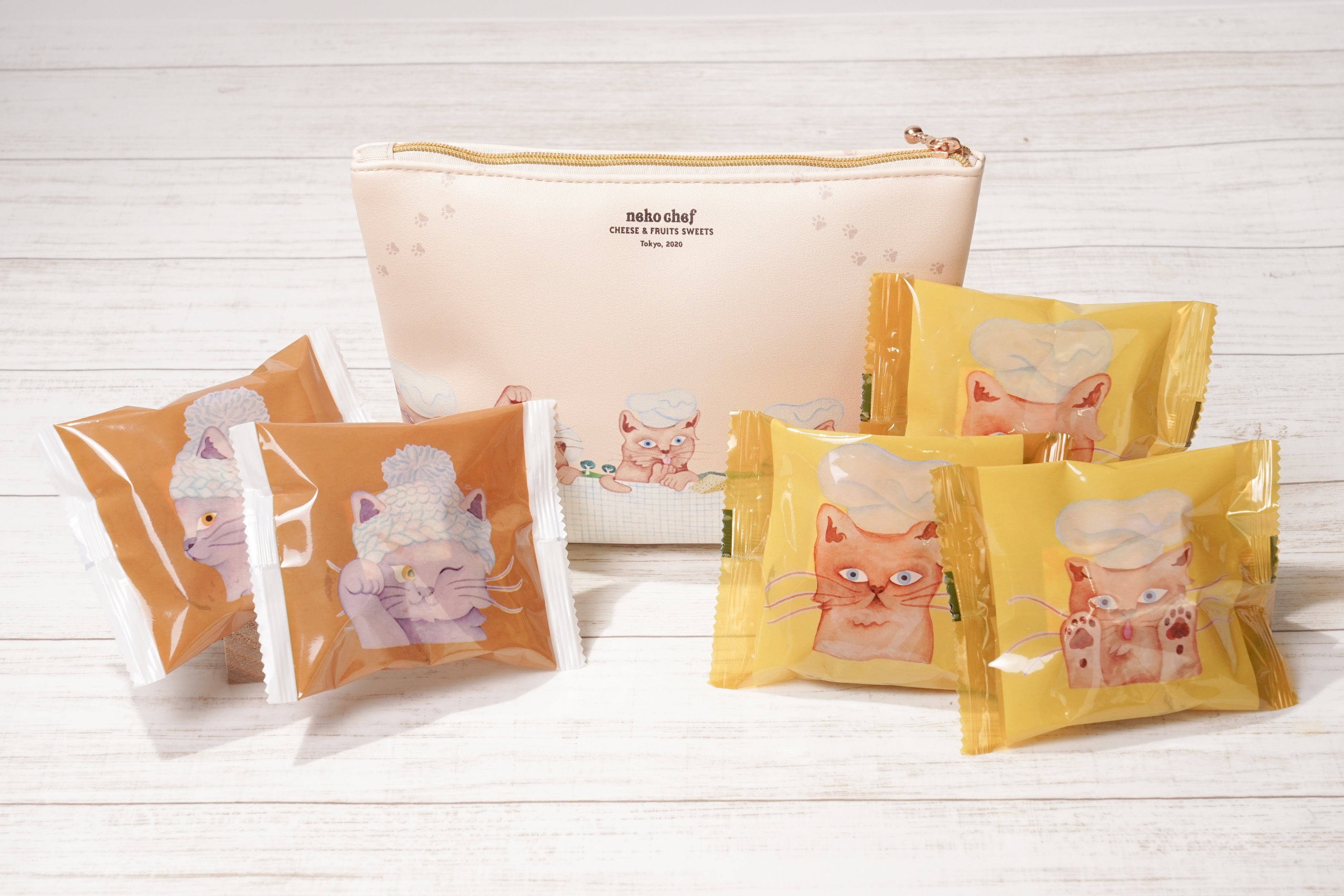 定番人気の「フィナンシェ」と、期間限定の「フィナンシェ ショコラオレンジ」に、オリジナルポーチがついた限定商品です!ポーチはマチ付で使いやすく、デザインはほっこり癒されるネコシェフ柄でご用意致しました。ファンなら手に入れたいアイテムです!