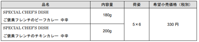 本年 2 月 7 日に「SPECIAL CHEF’S DISH ご褒美フレンチのビーフ カレー 中辛」と「SPECIAL CHEF’S DISH ご褒美フレンチのチキン カレー 中辛」を新発売しました。 鳥羽周作氏の味の設計図をもとに五味とスパイスを絶妙 なバランスで 整えた、「シェフが特別にふるまうカレー」です。