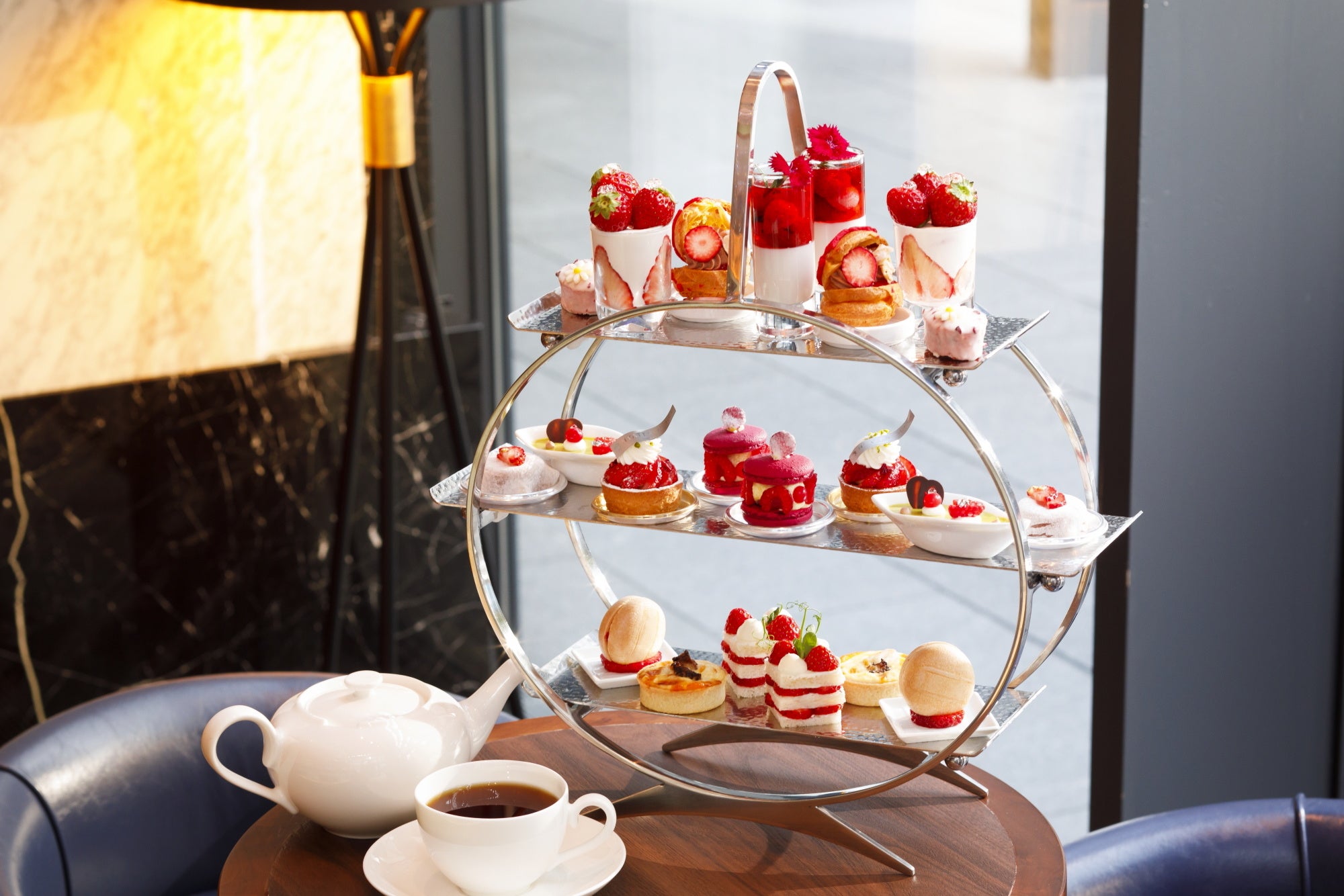 昨年も好評いただいたイチゴのアフタヌーンティーが今年も登場いたします。旬を迎えたイチゴを各地から選りすぐり、ペストリーシェフの山田晃司が腕によりをかけて渾身のスイーツの数々に仕上げました。イチゴとチョコレートのコンビネーションは和を感じる求肥包みに。まるでショートケーキのような愛らしいルックスのフルーツサンドはマスカルポーネチーズでさっぱりとお召し上がりいただけます。イチゴのつぶつぶ触感とみずみずしい果汁を余すことなくお楽しみください。