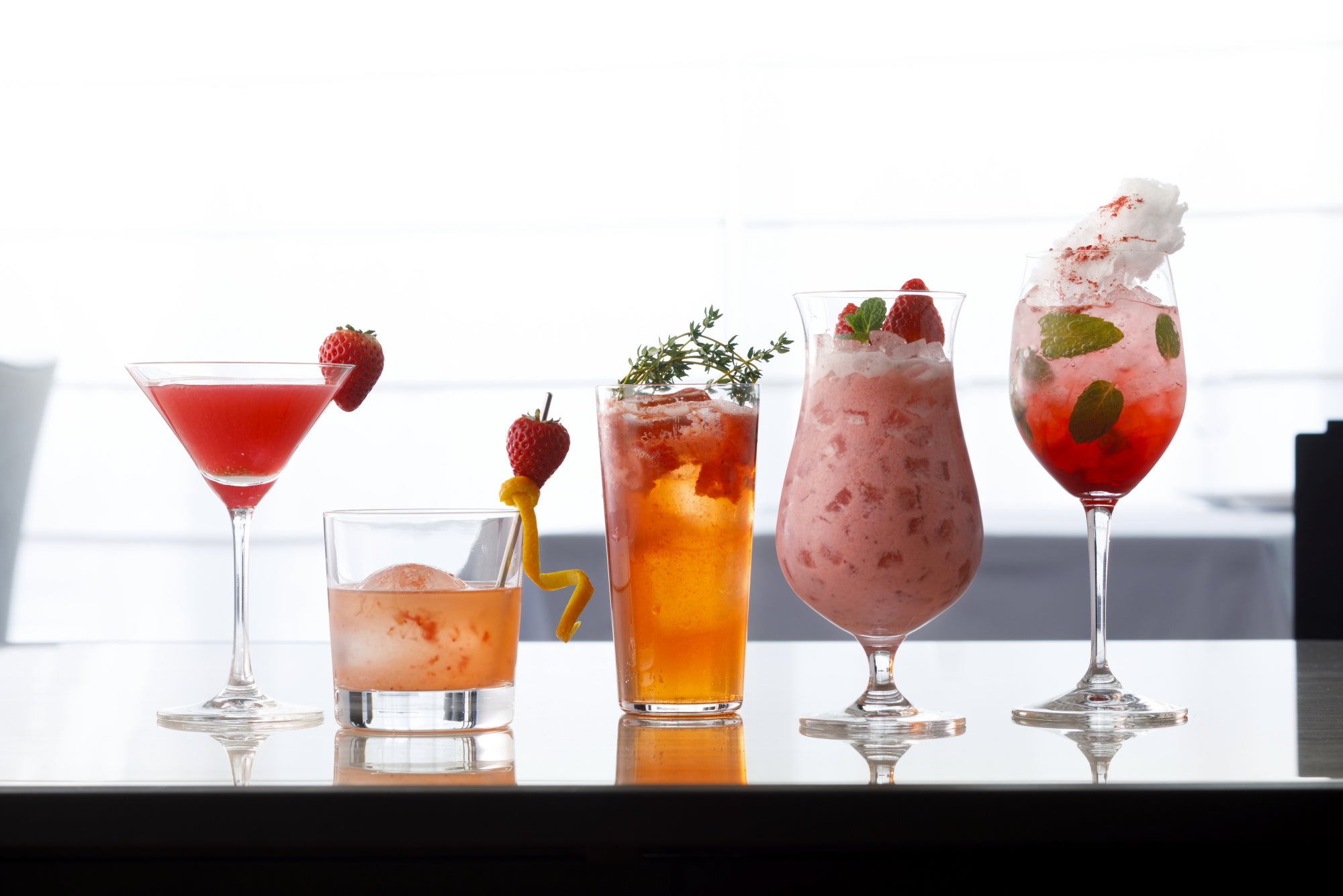 旬のイチゴをふんだんに使用したカクテルとカフェがラインナップ。ティーフレーバーのウィスキーでさっぱりと仕上げられたハイボールスタイルのカクテル「ベティハイボール」や、果実を贅沢に使用したパフェスタイルのミルクティー「ロイヤルフレーズ」など、デイタイムにもおすすめの爽やかなセレクションを揃えております。