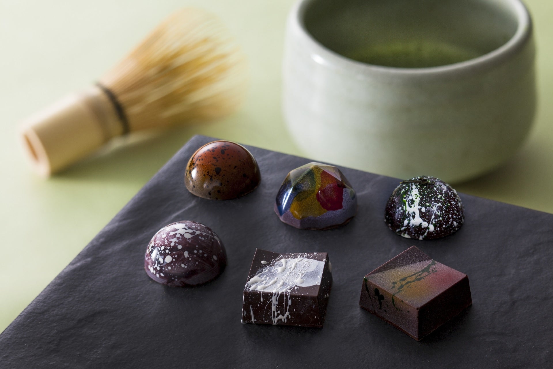 茶懐石とは、茶の湯の前に出される軽い食事を指し、飯、汁、向付、煮物椀、焼き物、濃茶で構成されます。海・山・里の幸が重ならないように、できるだけ異なる質のものを組み合わせた献立が良いとされています。そのような茶懐石料理のスタイルに、兵庫五国の地域色豊かな特性を生かし、各国の特産品を使用した6品の個性溢れるボンボンショコラに仕立てました。