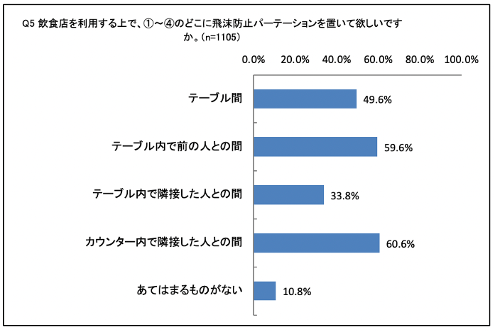 飲食店を利用する上で飛沫パーテーションを置いて欲しい箇所は『カウンター席で隣接した人との間』が60.6%、『テーブル席で前の人との間』が59.6%、『テーブル席間』が49.6%、『テーブル席で隣接した人との間』が33.8%となった。テーブル席間はもちろん、カウンター席にパーテーション設置を希望する人が半数以上存在することが明らかとなった。