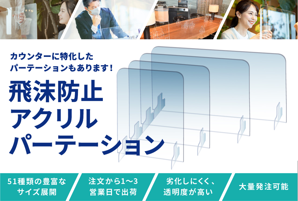 当社は、フルオーダーオリジナルグッズの企画生産で培ってきた輸入・生産管理技術を活かし、低価格で種類豊富な感染対策グッズを50種類以上展開しています。また、当社は飛沫防止用のアクリルパーテーションを国内最大級の規模で取り扱っております。
