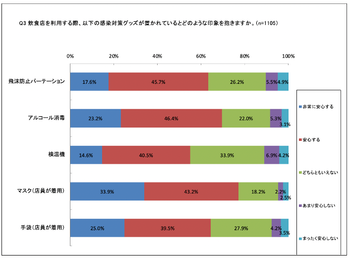どの感染対策も「非常に安心する」「安心する」が50%を超えているが、特にマスク、手袋、アルコール除菌など食材に手を触れる機会の衛生管理が70%近くを占めており、特に気にされていることがわかった。