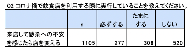全体数1,105名のうち、52.9%が「不安を感じたらお店を変える」と答えた。感染対策をしているかどうかを事前調査しお店が選ばれているわけではないが、実際に足を運んだ際に感染対策で不安を感じた際に、約50%の人にお店が選ばれない可能性があることがわかった。