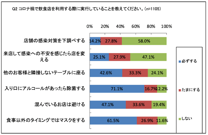 →感染対策をしているかどうかを事前調査してお店が選ばれているわけではないが、「飲食店での感染対策への不安が感じられたときに、1/2の確率でお店を変えられてしまうことがあるため、マスクの徹底や除菌、店内の客席の配置など感染対策の“見える化”が重要であると考えられる。