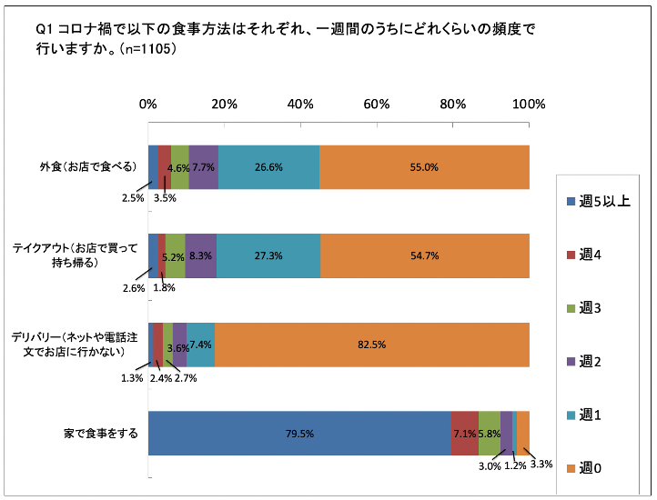 コロナ禍での食事方法は、家で週5回以上食事をする人が約79%であった。また、週に1回以上デリバリー(ネットや電話注文でお店に行かない)をする人が約17%であったのに対し、週に1回以上外食(お店で食べる)、テイクアウト(お店で買って持ち帰る)をする人はそれぞれ約50%であり、外食とテイクアウトは同じくらいの需要があることがわかった。