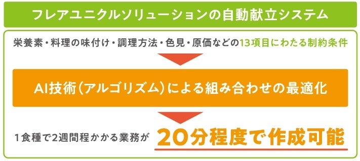 株式会社調和技研(北海道札幌市 代表取締役:中村 拓哉)は、株式会社フレアサービス(北海道旭川市 代表取締役:西村 達一郎)が開発・提供するAI自動献立システム「ユニクルAIオートメニュー」に、自社開発の数値系AIエンジン「furas」が採用されたことを発表いたします。