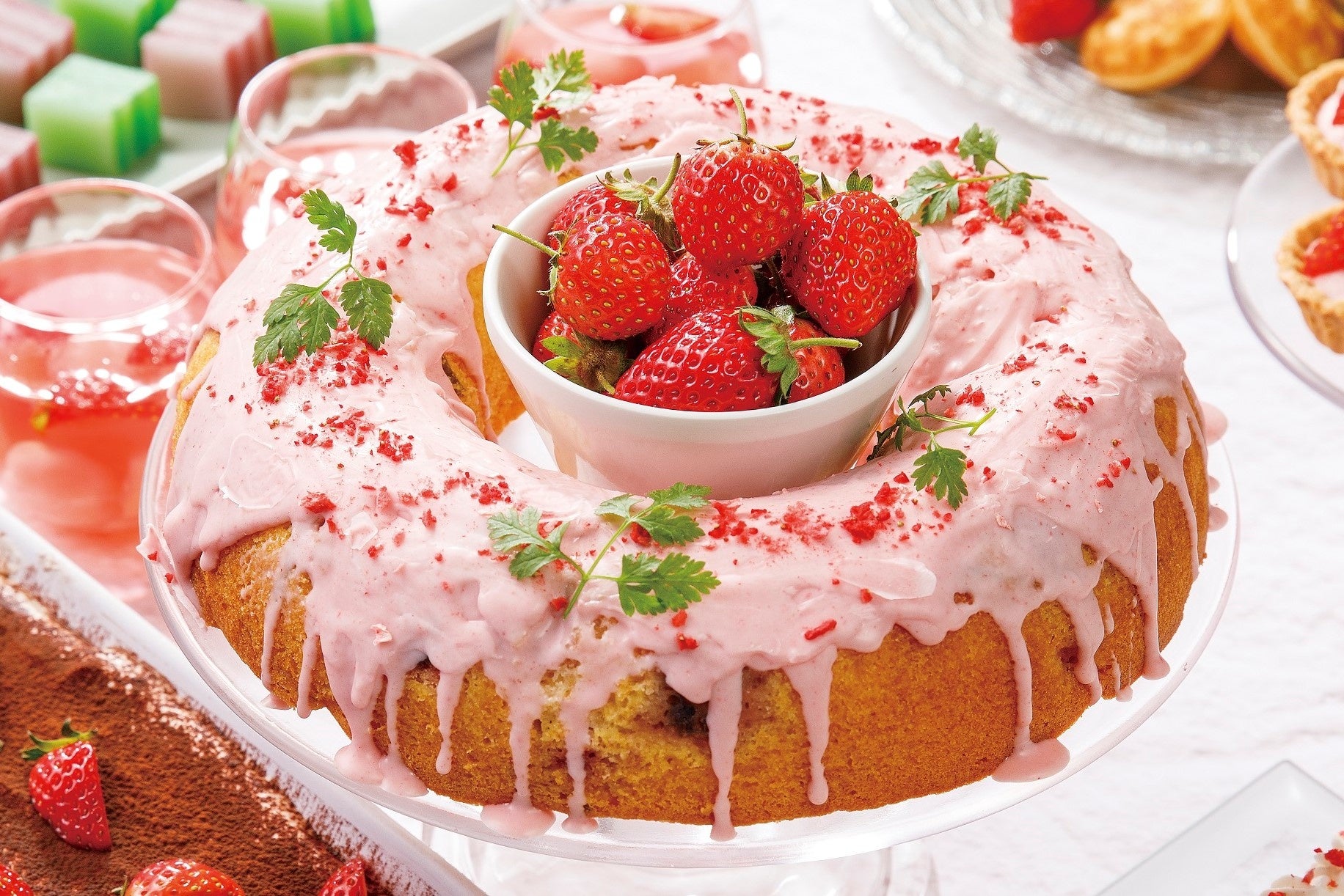 ホワイトチョコレートを溶かしたケーキ生地に、いちごを加えて焼いたケーキ
