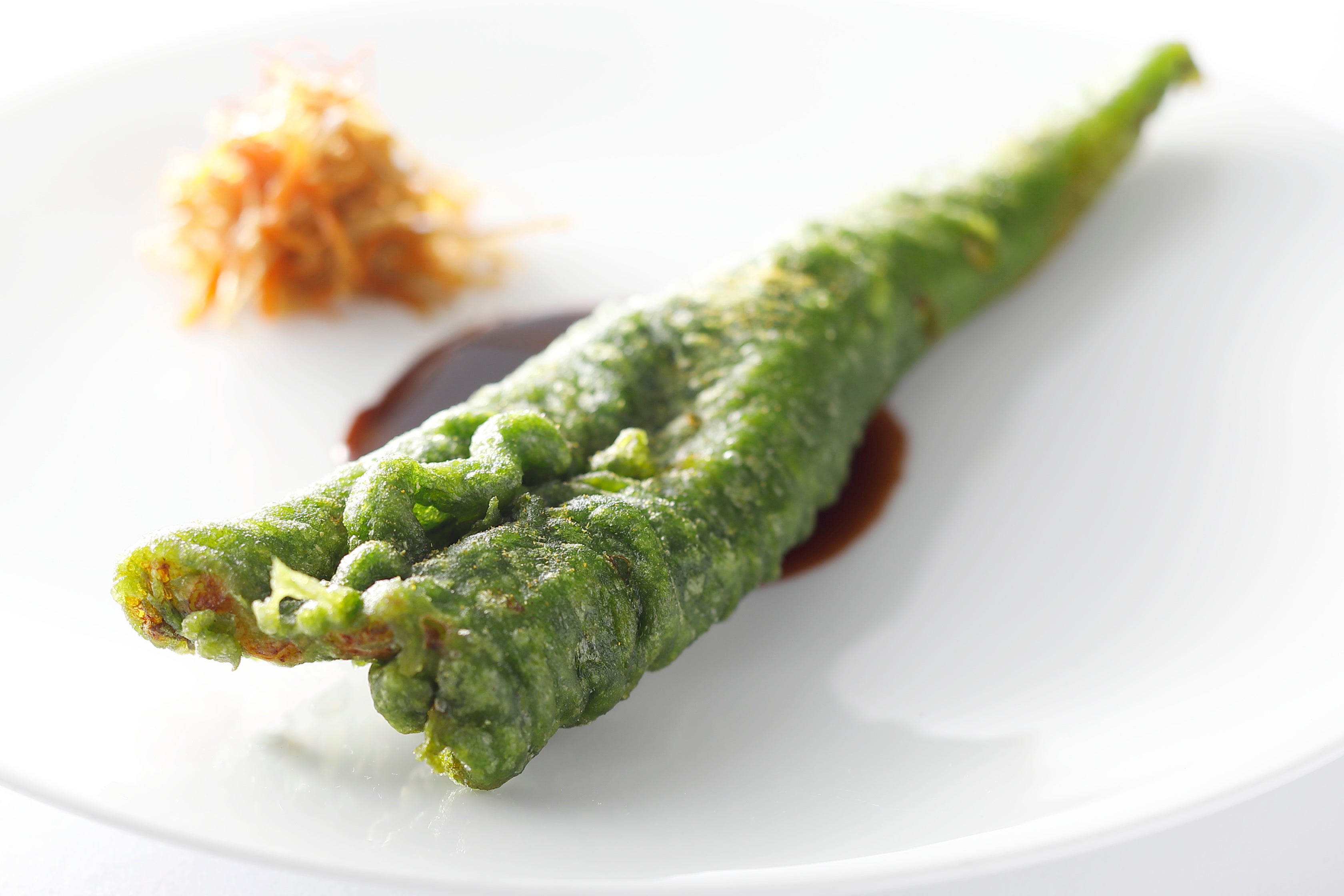 「情け嶋 麦冠 レモンサワー」と一緒におすすめするメニューは「江戸前穴子の天ぷら」。赤ワインやコニャックで作ったマトロートソースで仕上げる天ぷらは、爽やかなレモンサワーとよく合います。