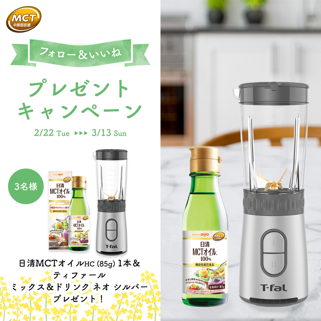 Instagramで日清MCTオイル公式アカウント 「@nisshinmct」 ( https://www.instagram.com/nisshinmct/ )をフォローし、2月22日(火)または3月2日(水)の該当投稿に「いいね」をしていただいた方の中から抽選で3名様に、BMIが高めの方の体脂肪やウエストサイズを減らす機能性表示食品「日清MCTオイルHC」と、「ティファール ミックス&ドリンク ネオ シルバー」をセットにしてプレゼント。お好みのジュースに「日清MCTオイルHC」を入れてお楽しみいただけます。