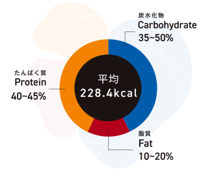 管理栄養士監修の元、厚生労働省の「日本人の食事摂取基準(2020年版)」を参考にしています。カロリーを多く含む脂質を抑え、たんぱく質の構成比を上げ、最適なPFCバランスを実現しています。また、1食300カロリー以下です。