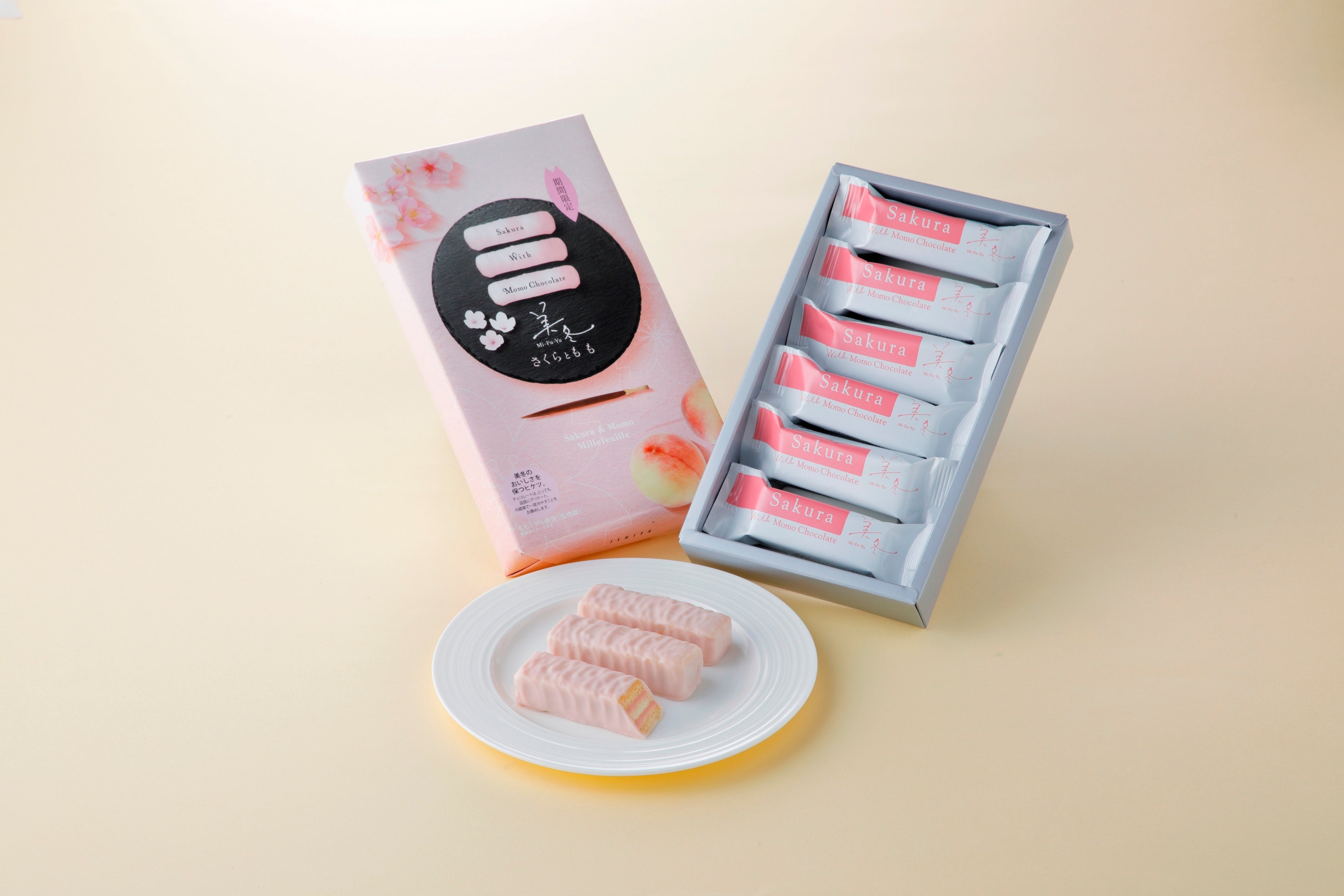 さくら風味のフィリングとサクサクのパイを重ね、もも風味のホワイトチョコレートでコーティングしました。