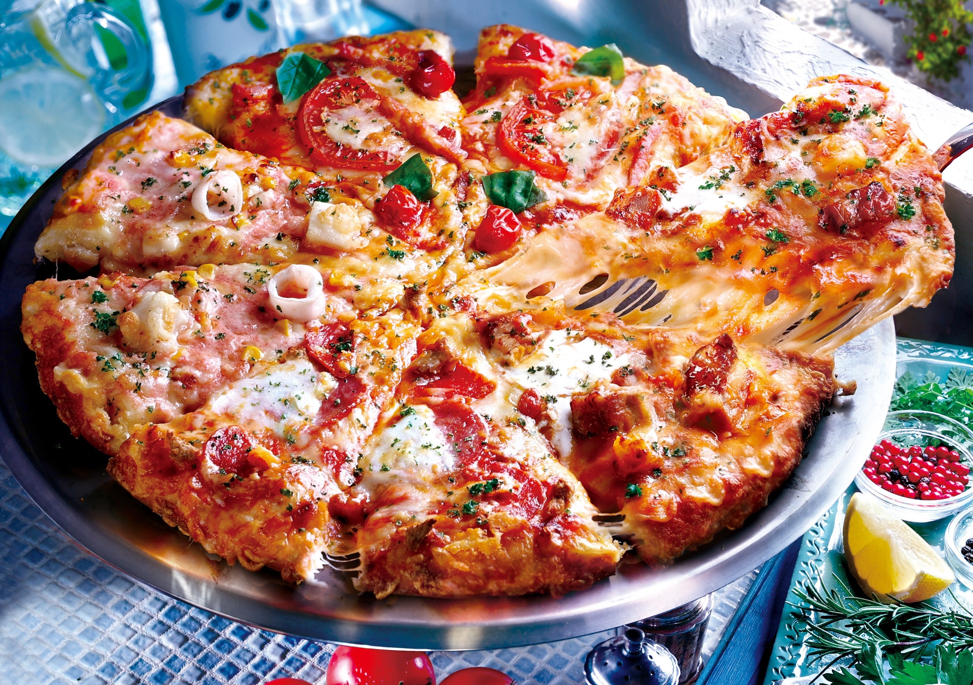 まろやかでコクのある特製バターチキンカレーソースに、柔らかくグリルしたチキンの旨みいっぱい『バターチキンカレー』、さらに本場博多の明太子を使用した『もち明太子』、2種のトマトにバジルの葉が香る『フレッシュトマト&バジル』、サラミやソーセージにモッツァレラチーズを合わせた本格ミートピザ『3種のミートミックス』と、バリエーション豊かな4種のピザが一枚に集結!