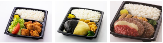 (左から、ヒカル考案 冗談抜きで旨いおかんの唐揚げ弁当(6個)/1,110円、ヒカル考案 冗談抜きで旨いハンバーグ弁当/1,310円、ツインハンバーグ弁当/1,310円)