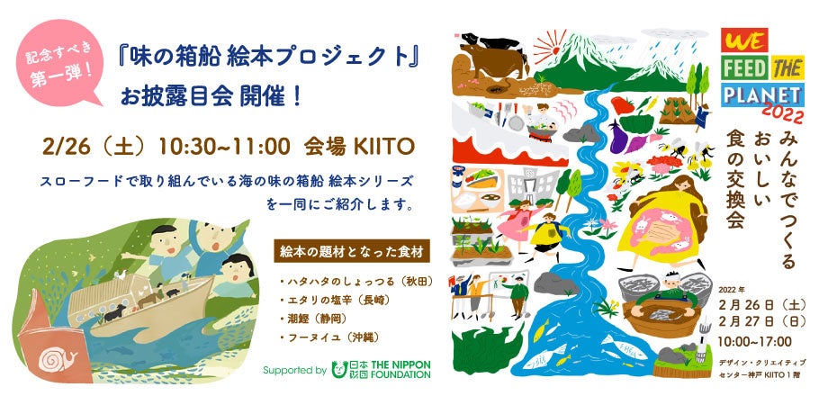 2022年2月26日・27日(土日)に、神戸で絵本の初お披露目会を行います。Slow Food Nipponと神戸市が共催する食のイベント「We Feed the Planet Japan 2022~みんなでつくる、おいしい食の交換会~」。2020年にも開催し、全国から地球を想う生産者や料理人、食の専門家たち、そしてスローフードの理念に共感する人々が集いました。「おいしい」を入口に、地球の抱える課題に気づき、日常から起こせるアクションにつなげていくイベントです。2022年開催のこのイベントのなかで、絵本プロジェクトのコーナーを設けます。絵本の制作過程のドキュメント映像を観てもらったり、題材となった4食材をおいしく食べられる会を催したり、4地域にまつわる何かしらのワークショップを企画したり…。様々なコンテンツを予定しています。