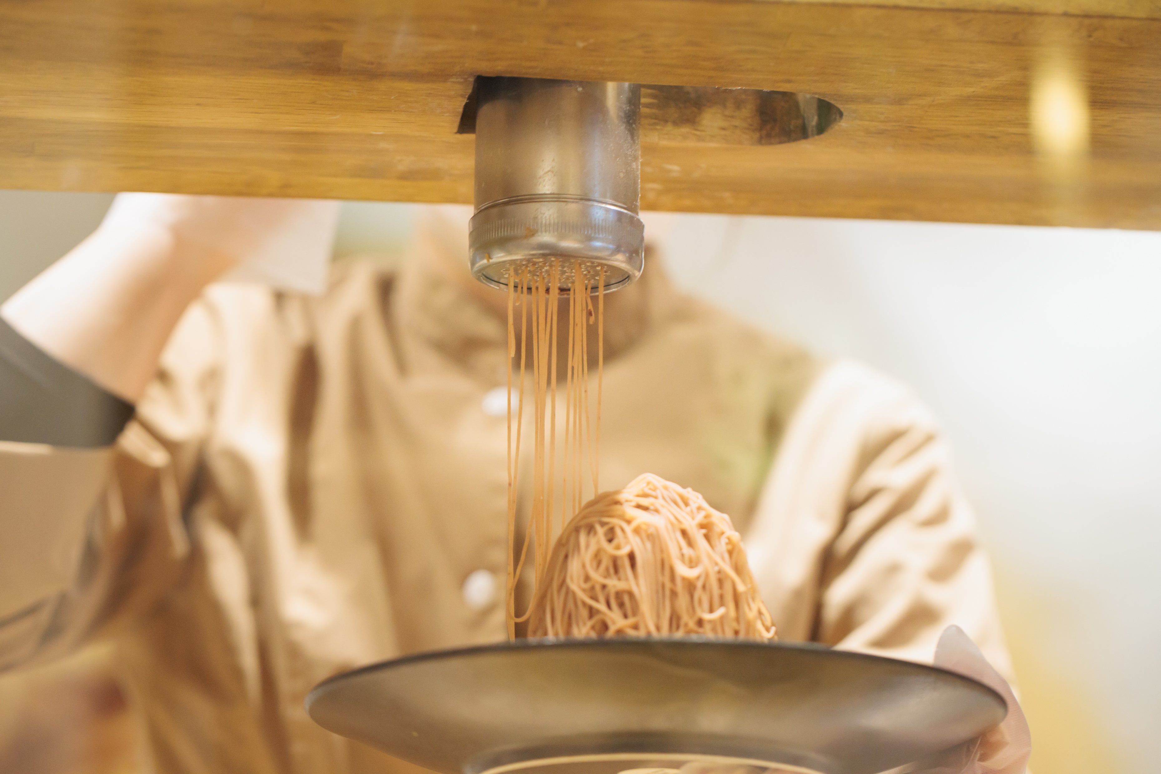 同ブランドでは、独自に開発したアンティーク調の搾り機を使用し、注文ごとにお客様の目の前で特製マロンクリームをたっぷりと搾り、仕上げに和栗の渋皮煮を乗せて提供します。目の前で、絹糸のように細く絞り出された茶色のマロンクリームが、真っ白なクリームの上にはらはらと広がっていく様子は、とても見応えがあり、SNS映えする動画が撮影できると話題です。