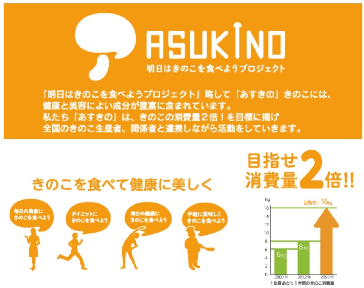 小池えのきでは、きのこの消費量を増やすために「明日はきのこを食べようプロジェクト(通称:あすきの)」に取り組んでいます。