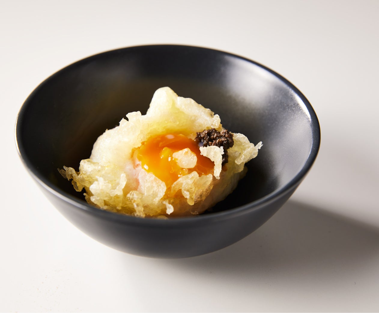 温泉玉子の天ぷらにトリュフのソースをのせた贅沢な一品
