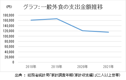 現在とコロナ以前を比較すると、各家庭での外食への消費支出の動向が大きく変化しています。グラフは総務省統計局が発表している「家計調査年報(家計収支編)」をもとに二人以上世帯の一般外食への支出金額の推移を示しています。コロナ以前の2019年の年間支出は16万6712円であったのに対し、2020年は12万921円で約27%の減少、2021年は11万5296円と約31%の減少となっています。新型コロナウイルスの感染拡大により、外食控えや在宅勤務が影響したと考えられます。
