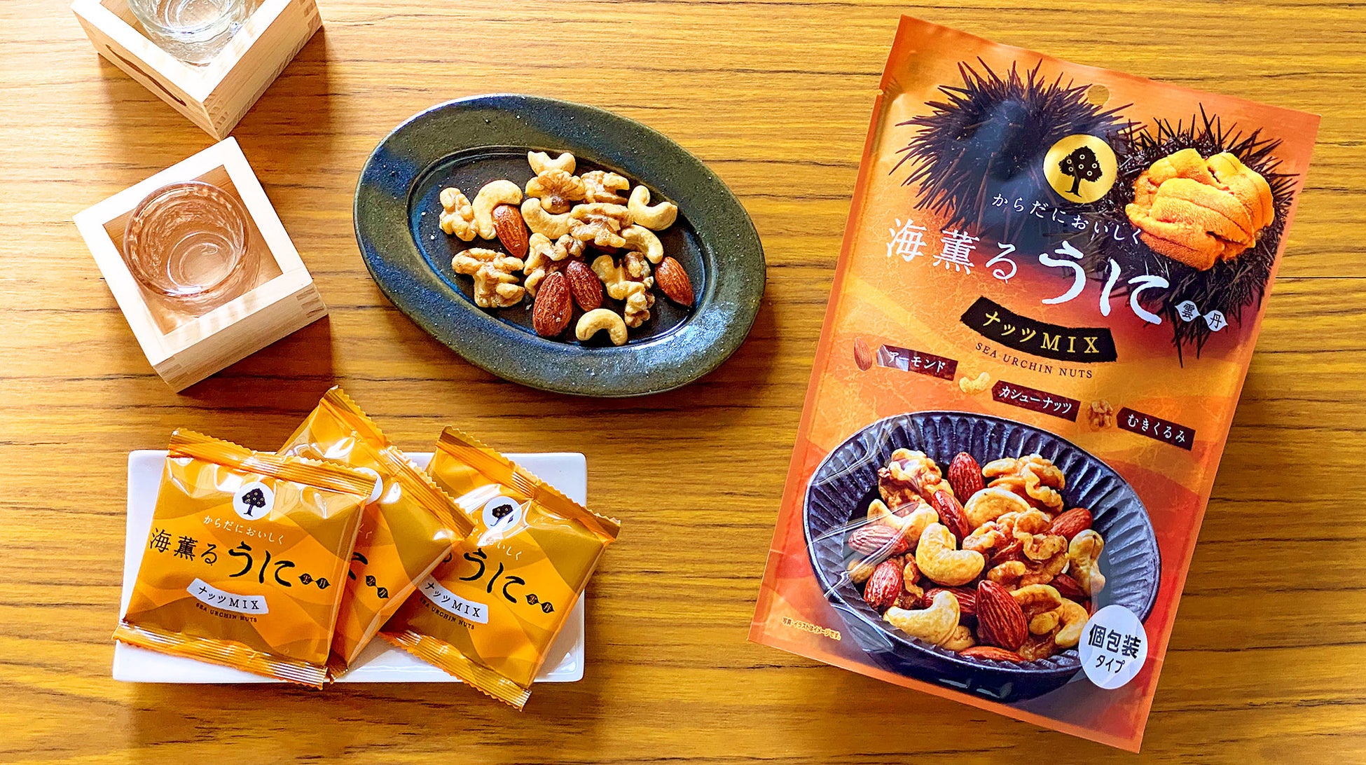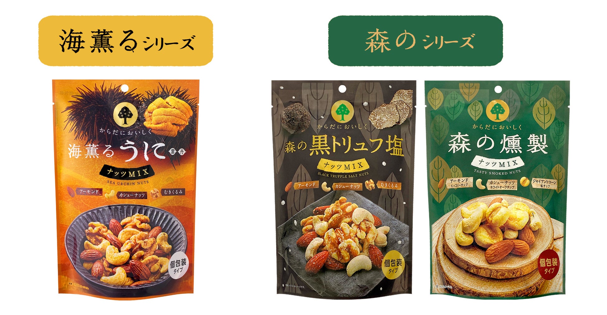 ナッツを贅沢にアレンジすることで、こだわり志向の方にご愛顧いただいているシリーズです。黒トリュフ塩をナッツの表面に効かせ、香り高い贅沢な味わいをお楽しみいただける「森の黒トリュフ塩ナッツミックス」、“ヒッコリー”、“ホワイトオーク”、“桜” の3種類のチップでそれぞれに燻したナッツをお楽しみいただける「森の燻製ナッツミックス」に加えて、今回「海薫るうにナッツミックス」が新しく仲間入りいたしました。