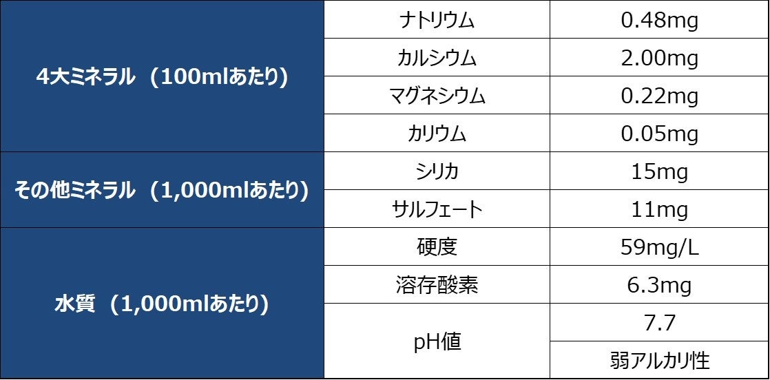硬度は59mg/Lの軟水で、4大ミネラル成分のカルシウム、マグネシウム、カリウム、ナトリウムに加え、皮膚や毛髪等、体の様々な部位に含まれる「シリカ」、アーモンドやブロッコリー等にも含まれている硫酸塩と呼ばれる「サルフェート」が含有されており、豊かな土壌で育まれた、自然本来のおいしさを味わうことができます。