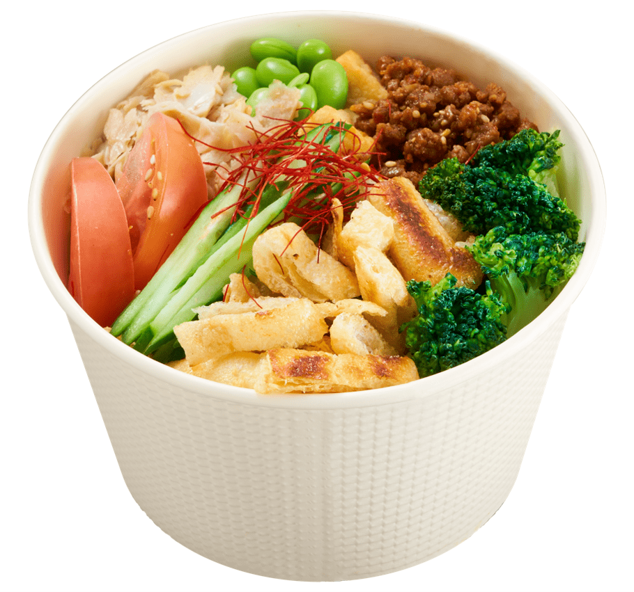 本格食感のプラントベースチキンとオリジナルのバンバンジーマヨネーズがやみつきになるソイミートバンジーサラダ。タンパク質15g・食物繊維6gが入った、普段の食事から無理なくタンパク質をとりたい方におすすめしたい、バンバンジー風サラダです。