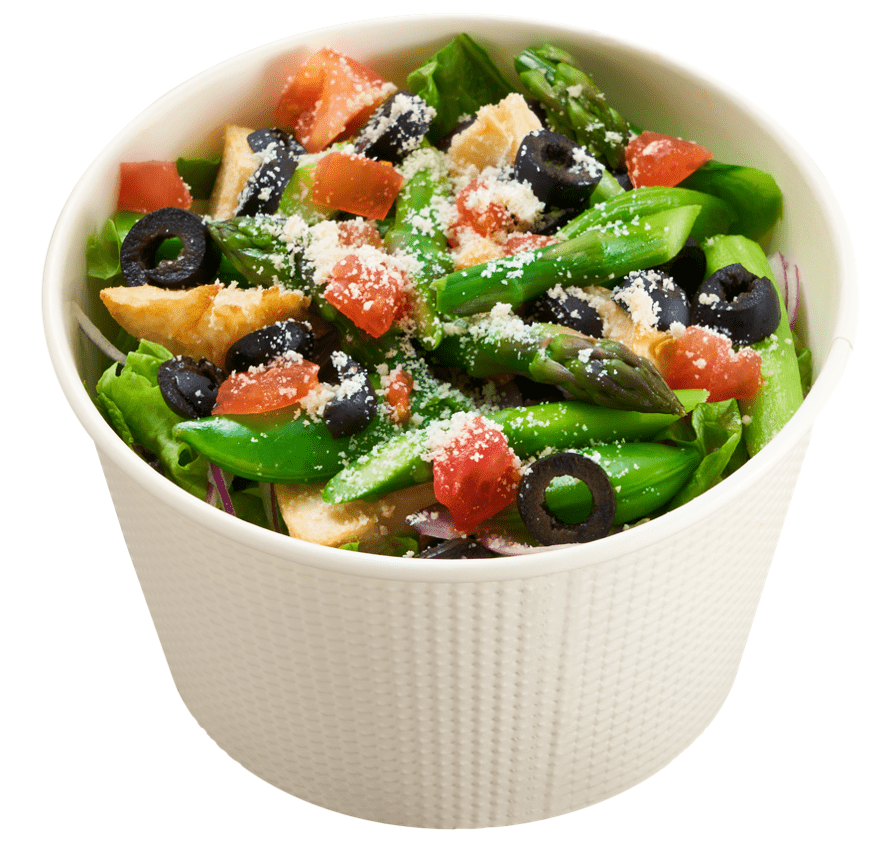 濃厚な味わいがやみつきになるクリーミーシーザーサラダ。たけのこ・アスパラガス・スナップエンドウの春野菜が、動物性原材料不使用なのに濃厚クリーミーな2foods特製ドレッシングとの相性抜群です。一日に必要な1/2の野菜量※が摂れる、普段の食生活で野菜が足りていない方におすすめしたい具だくさんサラダです。