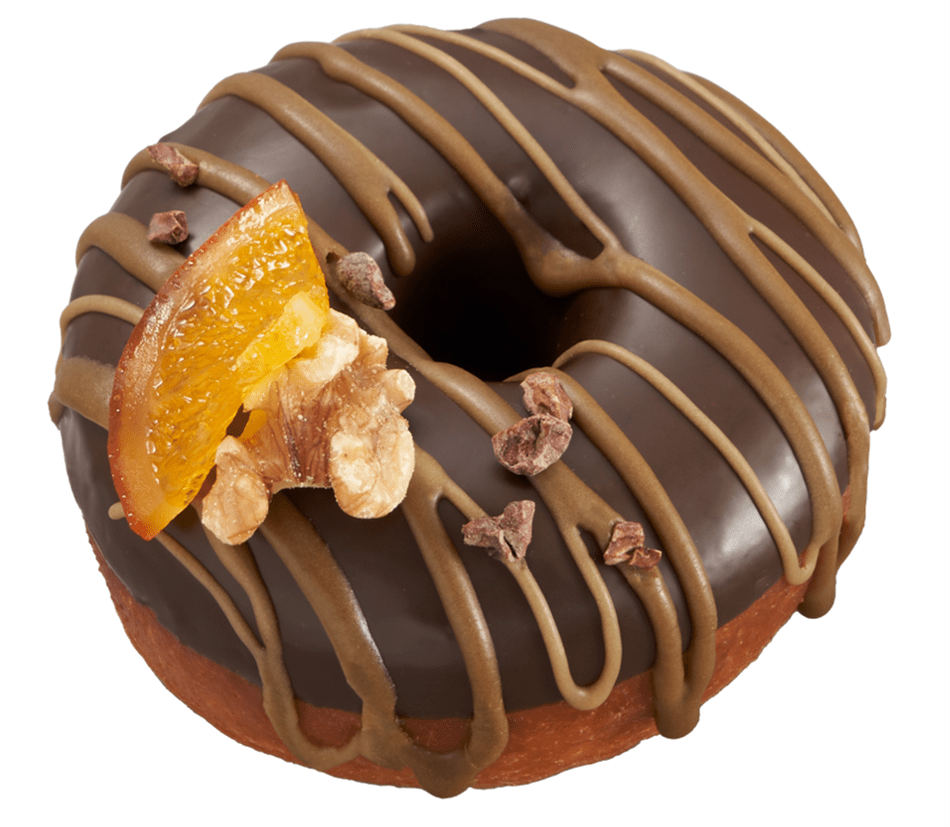 ほろ苦いビターチョコレートでコーティングしたドーナツに、食べるごとに味の変化を楽しめる香ばしい2色のほうじ茶のグレーズとパウダーをトッピングしました。ほうじ茶の香ばしさの中に、トッピングのオレンジが爽やかに香る、春季限定ドーナツです。