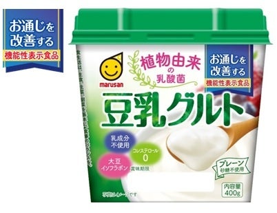 「豆乳グルト」は、現在注目が高まっている植物性ヨーグルトの先駆けとして2010年に発売いたしました。豆乳のみならず乳酸菌も植物由来にこだわり、乳アレルギーの方にも安心してお召し上がりいただけるプレーンタイプの豆乳ヨーグルトとしてご好評いただいております。当社では「豆乳グルト」の研究を続ける中で、「お通じを改善する」機能に関して消費者庁に届出を行い、機能性表示食品として受理されました。これを受け、「豆乳グルト 400g」を「お通じを改善する」というヘルスクレームを掲げた機能性表示食品として3月1日(火)よりリニューアル発売いたします。