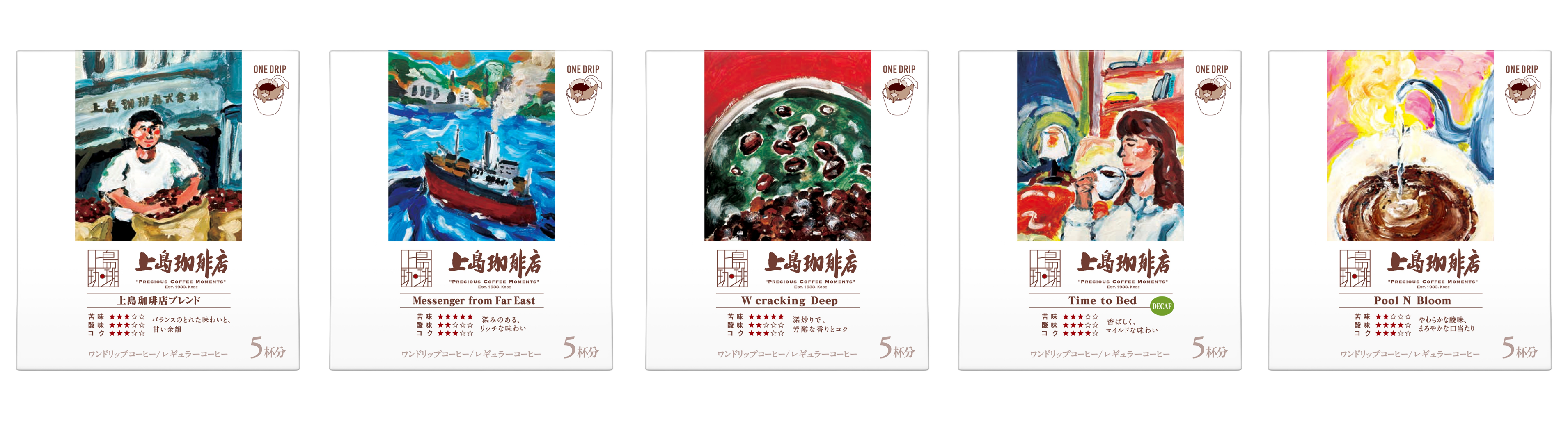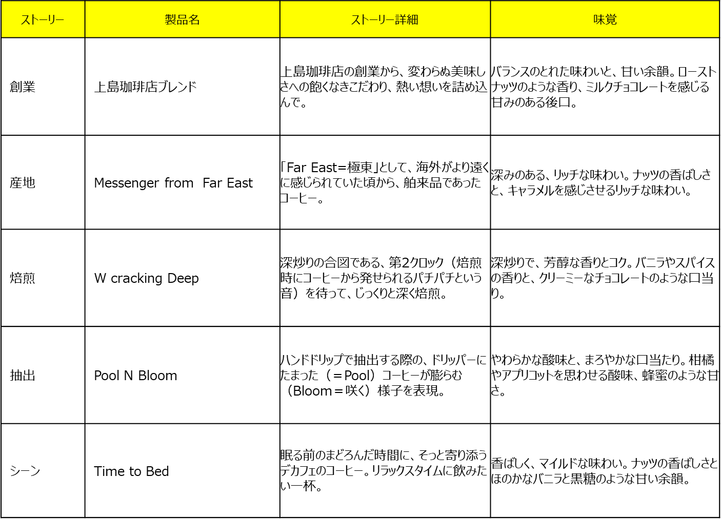 こうした消費者動向を背景に、この度、大人のための上質なコーヒー専門店『上島珈琲店』の味わいをご家庭でお楽しみいただけるブランドを立ち上げ、「創業」「産地」「焙煎」「抽出」「シーン」の5つの“ストーリー”を楽しめる5種類のブレンドを豆、ワンドリップ、粉の3カテゴリーで製品化します。