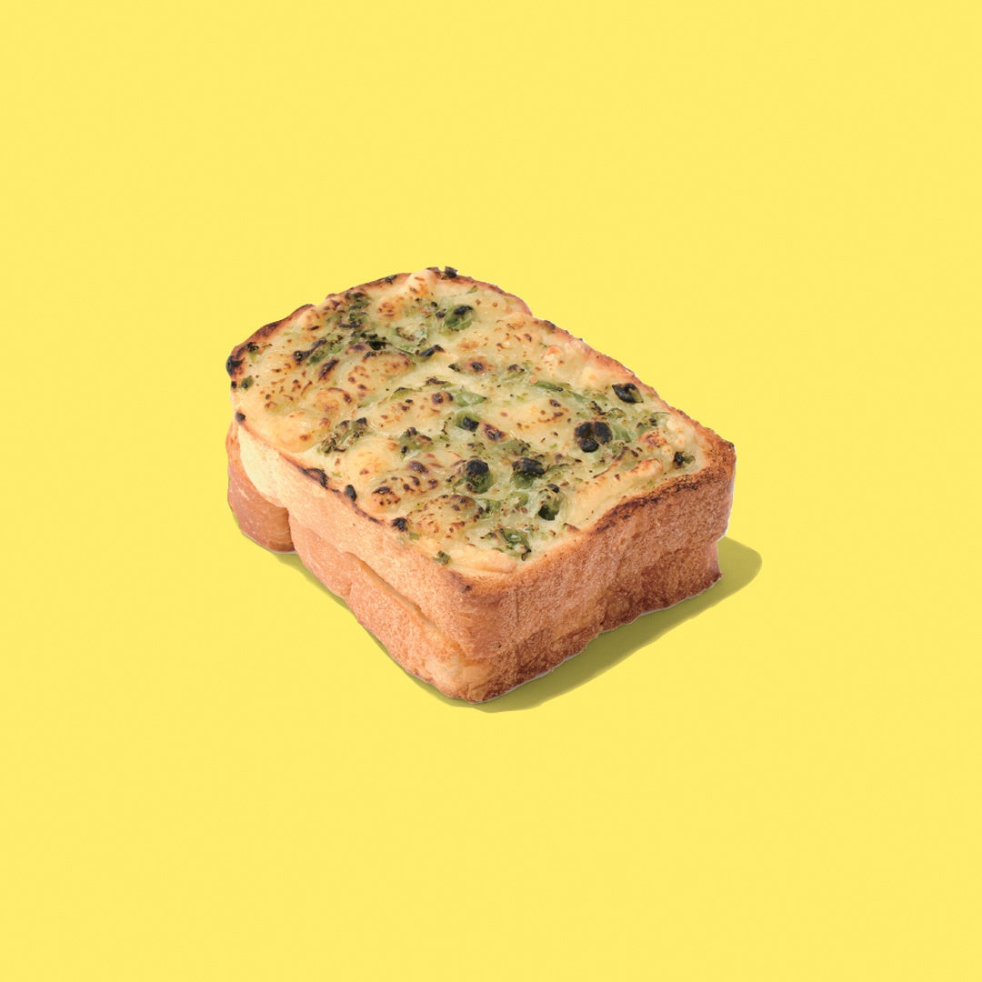 ハニー食パンに、マッシュしたグリーンピースとベシャメルを合わせた“自家製スマッシュピー”とチーズをトッピングし、新じゃがとパンチェッタにガーリックをきかせたフィリングを挟み焼き上げました。