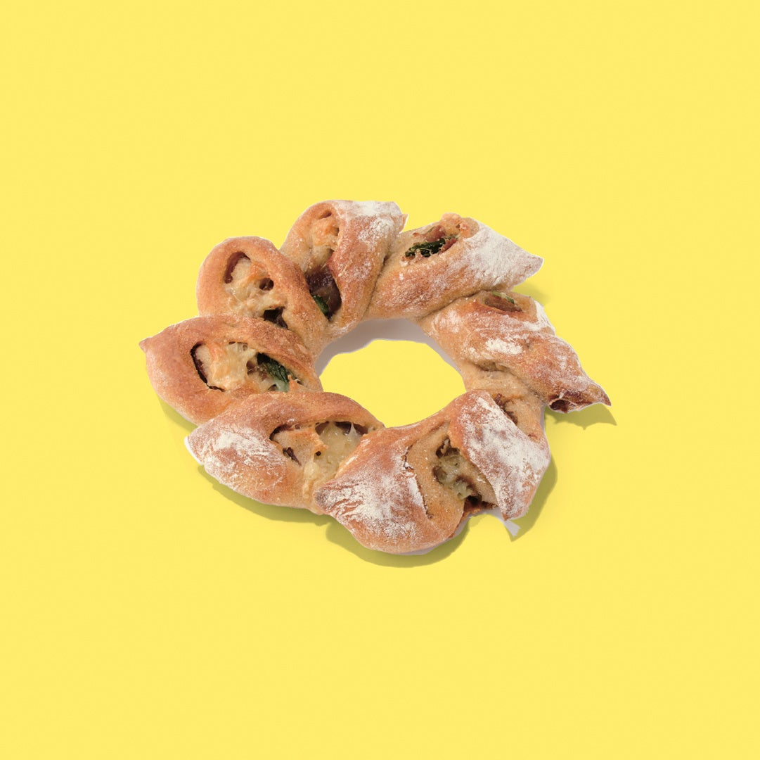 ブールアンジュオリジナル生地でアスパラ・生ハム・ブリーチーズを巻いてリングエピ型に焼き上げました。