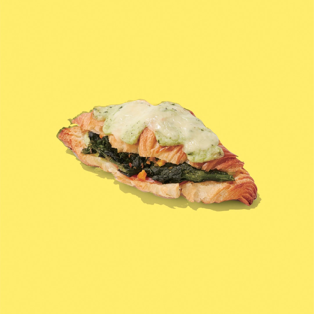 菜の花のピューレとホワイトソースを合わせた特製ソースをトッピングし、ロースハム・ゆで卵・特製ソースをサンドしました。