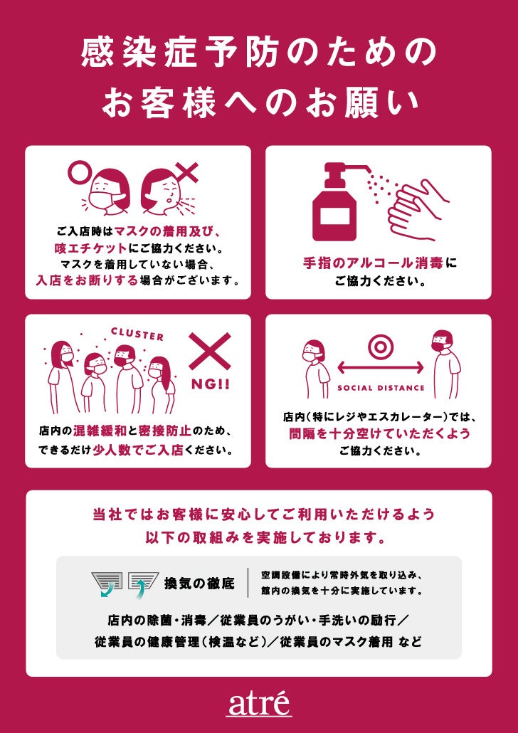 アトレでは、お客様、従業員及び関係者の皆様の安全性を考慮し、新型コロナウイルス感染拡大防止の為の対策を講じます。また、来店されるお客様へのご協力のお願いがございます。