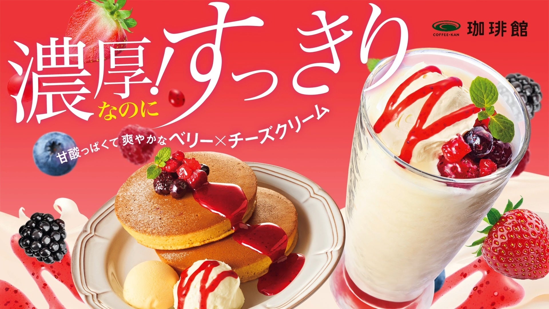 『珈琲館』が贈る今年の春限定メニューは、甘酸っぱい4種のベリーと濃厚なチーズクリームを使用した華やかなフローズンドリンクとホットケーキの2種類。