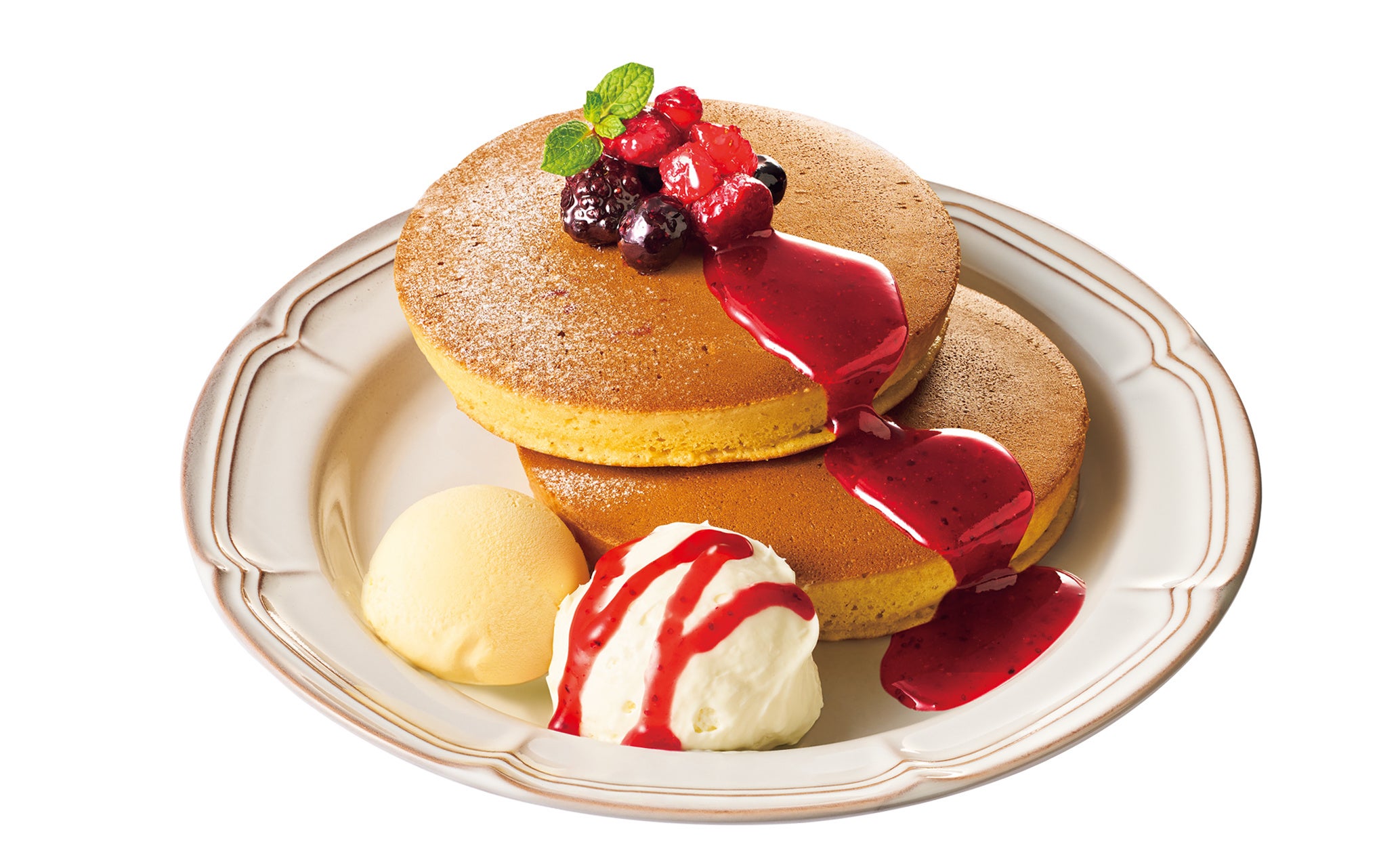 「4種のベリー&チーズクリームのホットケーキ」は、専用の銅板で丁寧に焼き上げたトラディショナル・ホットケーキに、特製チーズクリームと、甘酸っぱいベリーが絡み合う、爽やかな一皿です。別添えのストロベリーソースを加えることで、甘酸っぱさが増し、よりいっそう華やかな香りと味わいが広がります。