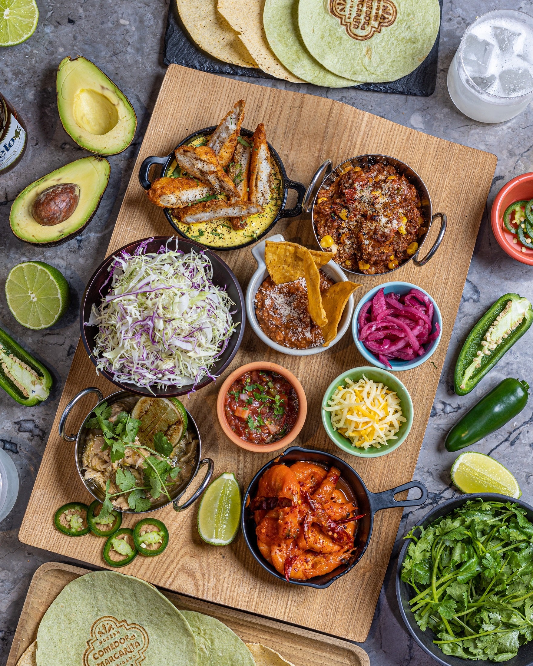 特製トルティーヤに、お好みのフィリングとトッピングを自分で選んで楽しんでいただく「タコス・エンペラドール」は、日本ではなかなか珍しい本場スタイルのタコス。グランドオープンのお目見えから、メキシコの太陽を思わせるカラフルな陶器に並べてご提供していましたが、今回のリニューアルでは、スペイン語で「皇帝」を意味する「エンペラドール」という、その名にふさわしい迫力を持ち合わせての登場です。