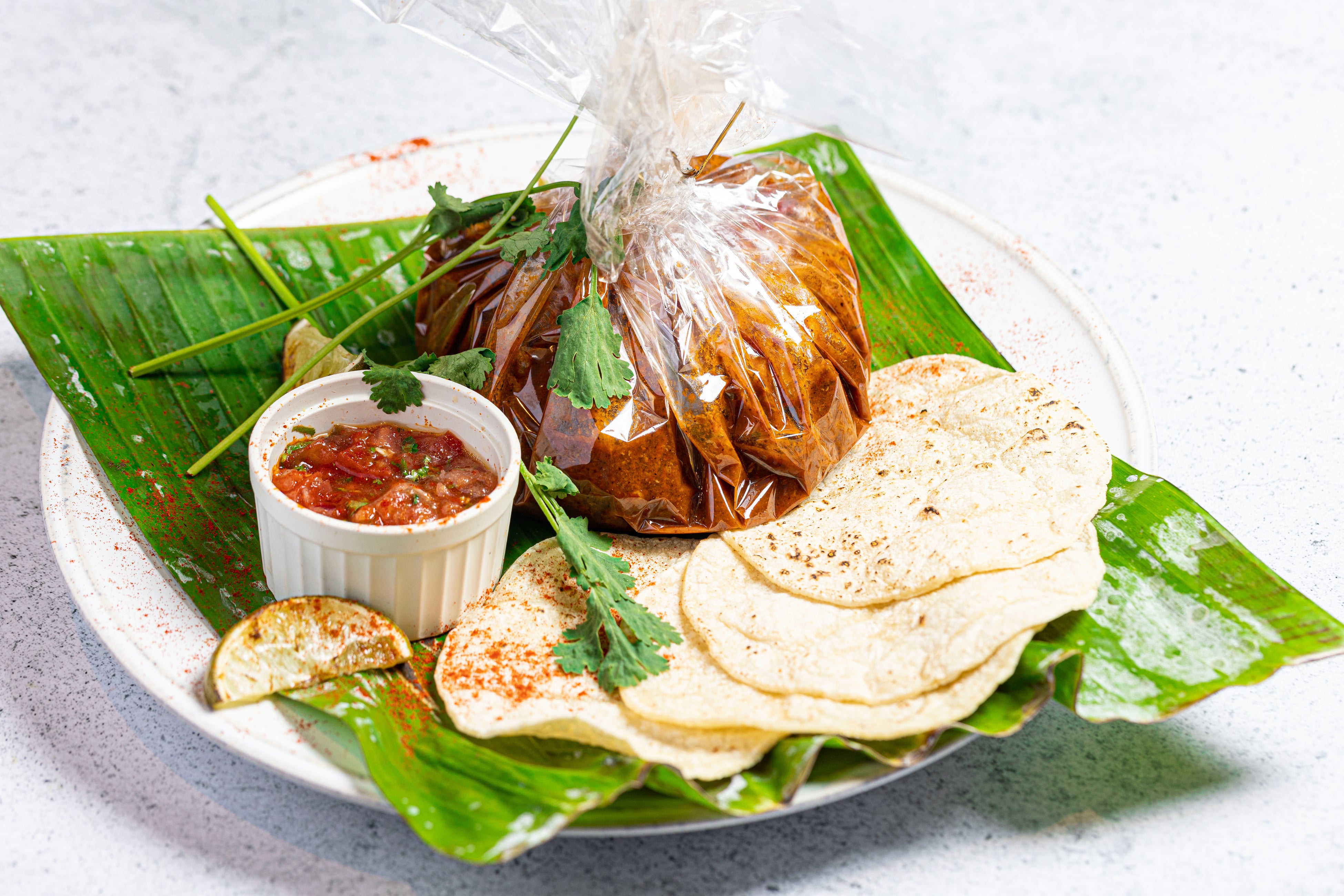 お客様の目の前でセロファン切って、湯気とともに立ち上るスパイスの香りと共に、トルティーヤに包んでお愉しみください。