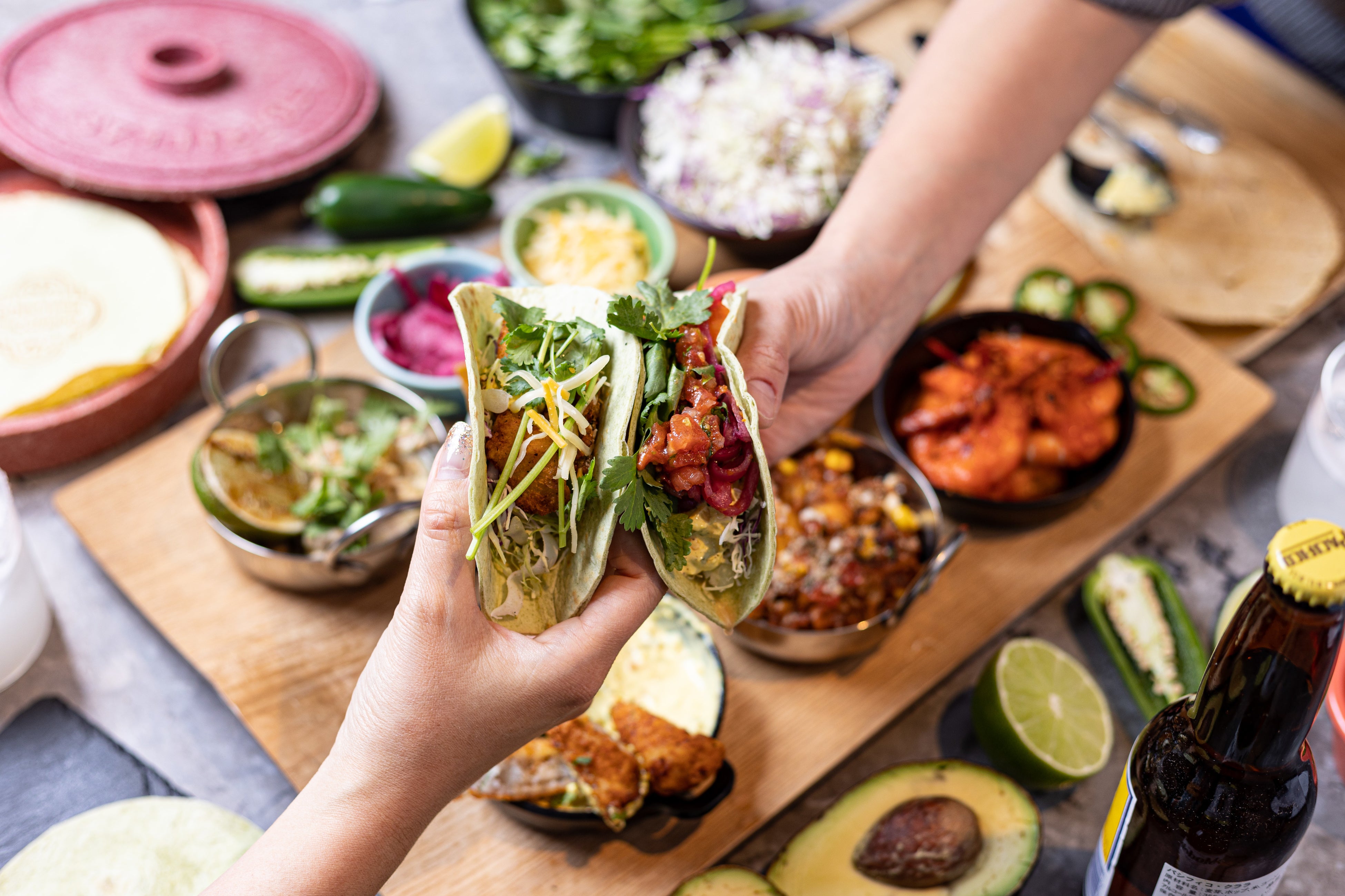 主役のフィリング4種に、お好みのディップやサルサソース、チーズ、ピクルスをトッピングして、自分好みのタコスに仕上げてください。