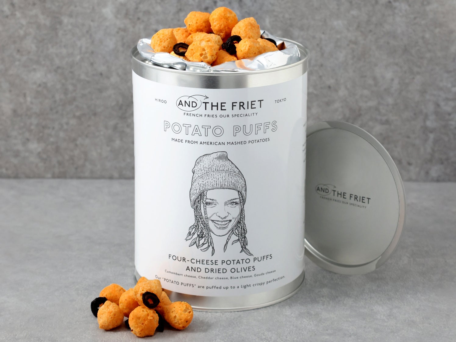 クワトロチーズ(カマンベール、チェダー、ゴーダ、ブルーチーズ)フレーバーのポテトパフに、