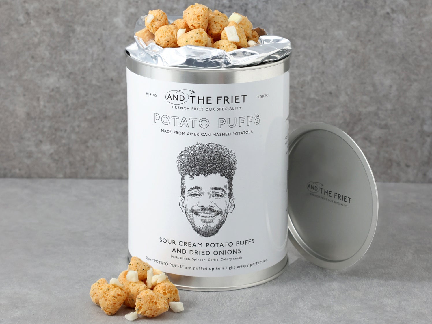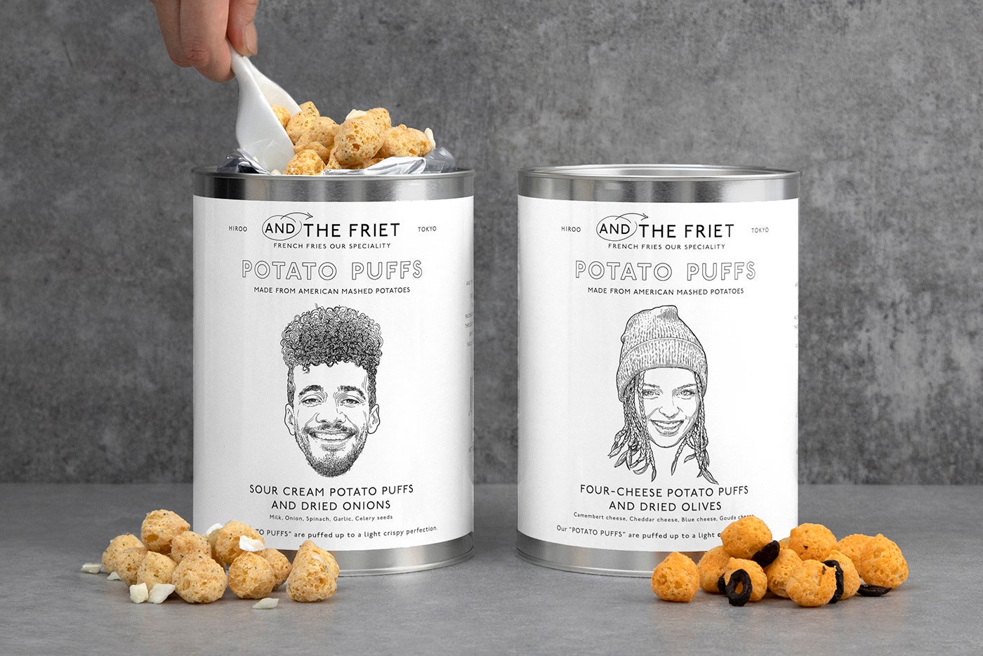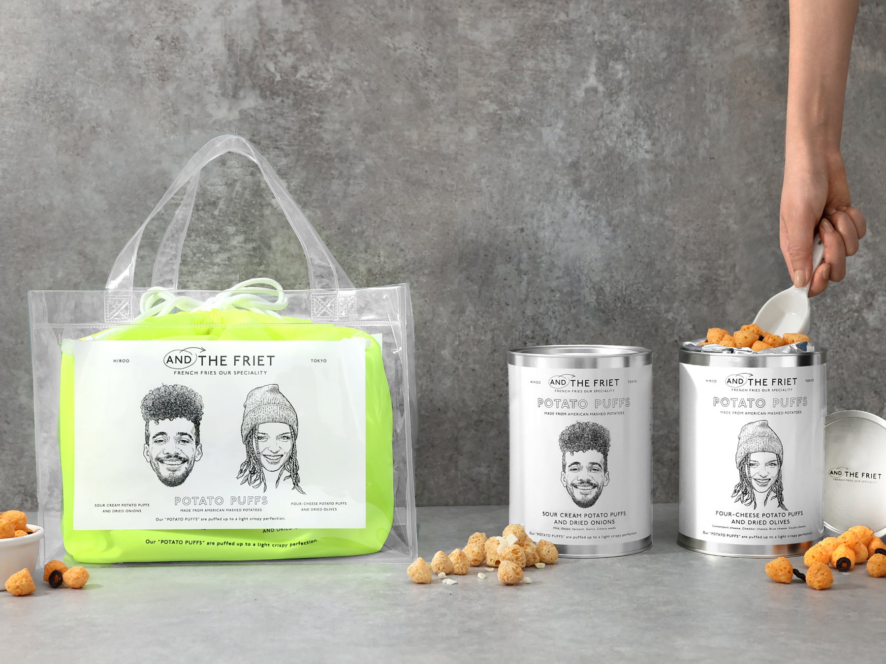 ペンキ缶のようなパッケージは、アートディレクター平林奈緒美氏によるデザイン。イラストレーターAnje Jager氏によるカップルのイラストが描きおろされています。発売を記念したオリジナルクリアバッグセットも見逃せません。おやつにおつまみに。ギフトにもおすすめのリッチなパフスナックを、ぜひお楽しみください。
