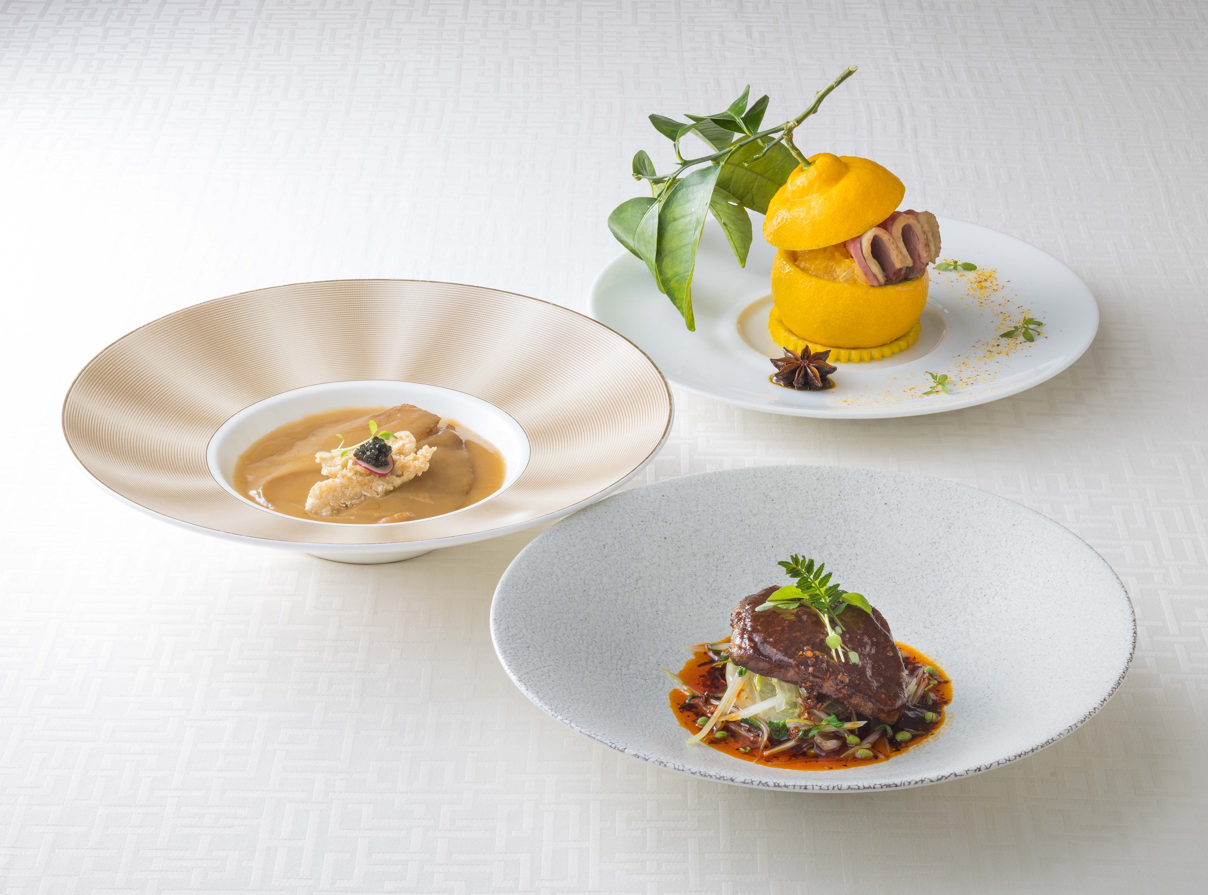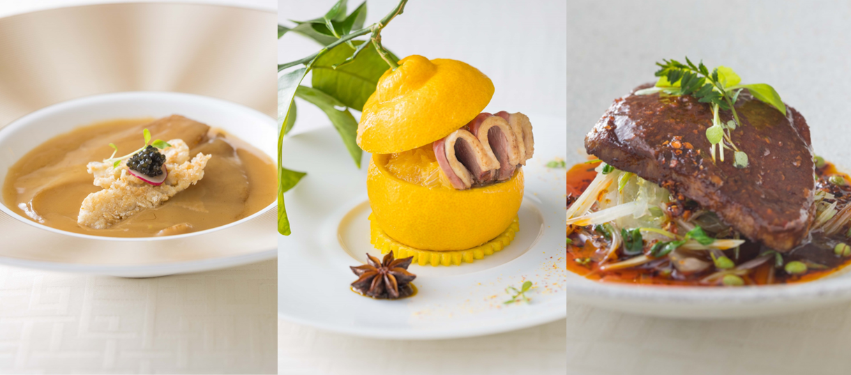素材の魅力を最大限に活かしてつくられるディナーコースは、南北に長い和歌山県で育まれた厳選食材を駆使し熟練の技で仕上げた逸品をご用意いたしました。鮮やかな黄色の三宝柑(サンポウカン)を器に使用した冷前菜は、濃厚な脂のコクが特長の紀州鴨を軽く炙り甘みと柔らかさを引き出し、三宝柑の果肉で作った自家製の醤(ジャン)と合わせ爽やかに仕上げました。星ヶ岡のシグネチャーメニューであるふかひれの姿煮は、熊野山麗の澄んだ水で育てられた近大キャビアとおこげを添え食感の違いも楽しめる贅沢な一皿に。肉料理は、四川料理を代表する水煮牛肉を上品にアレンジ。芳ばしく煎り焼きしたきめ細やかで柔らかい肉質が特長の熊野牛のフィレ肉は、唐辛子と丁寧に作られた醤(ヒシオ)ソースとの相性が格別で、清々しいぶどう山椒の香りが食欲をそそります。和歌山県の良質な食材を使った、和魂漢才の考えのもと紡ぎだされる美味をご堪能ください。
