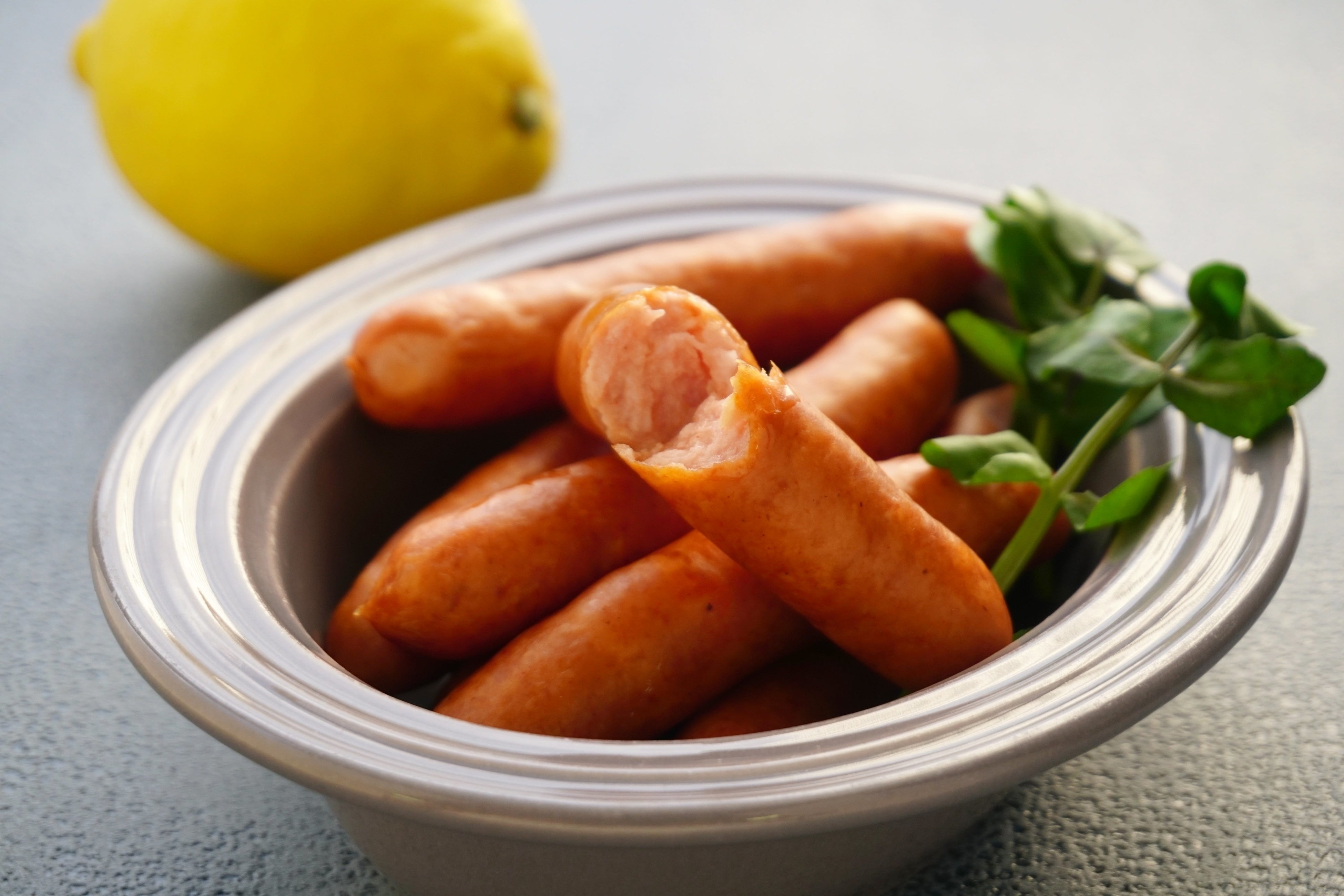 瀬戸内レモンを皮や果汁含め丸ごと使用。レモンの皮は塩と砂糖で煮込み鮮やかな黄色と香りのピール煮に加工し、果汁と共に生地に加え、爽やかな口当たりのウインナーに仕上げました。ウインナーは国産豚のウデ肉のみを使用し、挽き目を変えた2種類の挽肉を練り上げています。ウデ肉は肉の食感と脂を両方楽しめる部位のため、ジューシーで歯応えがあります。成城石井のウインナーにはなめらかな生地が特長の絹挽き製法もありますが、この瀬戸内レモンウインナーはジューシーな粗挽き製法を採用することで、ウインナーのジューシーさとレモンとの相性を絶妙に活かしました。ボイル、焼きのどちらでも楽しんでいただけます。